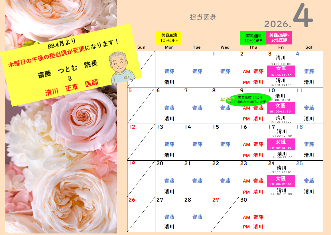 - 毎月 第4金曜日は、美容形成外科の診察を行っておりましたが、2024.1月で終了となります。