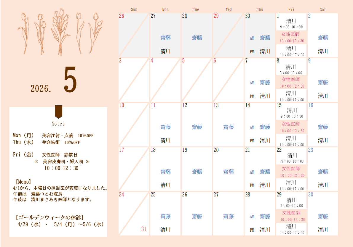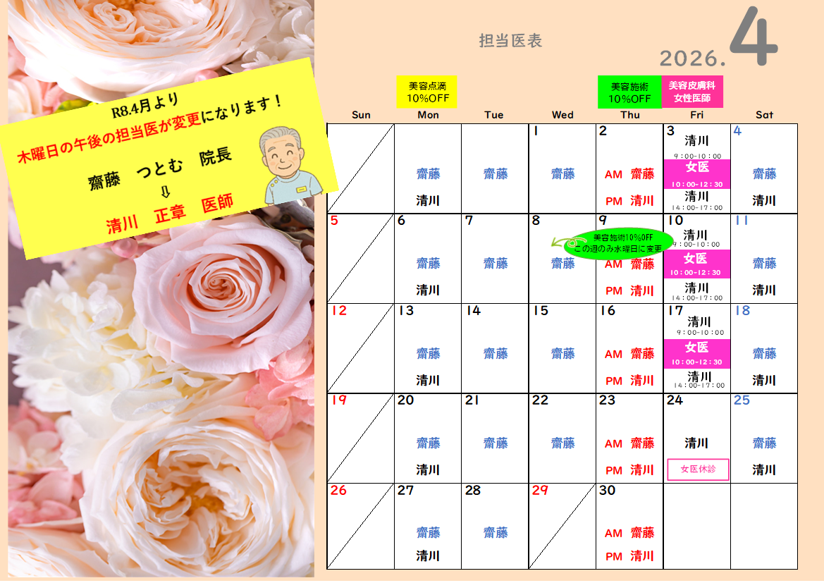 ② 4/24(金)清川寧子医師が休診のため、終日、清川正章医師の診察となります。